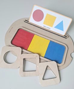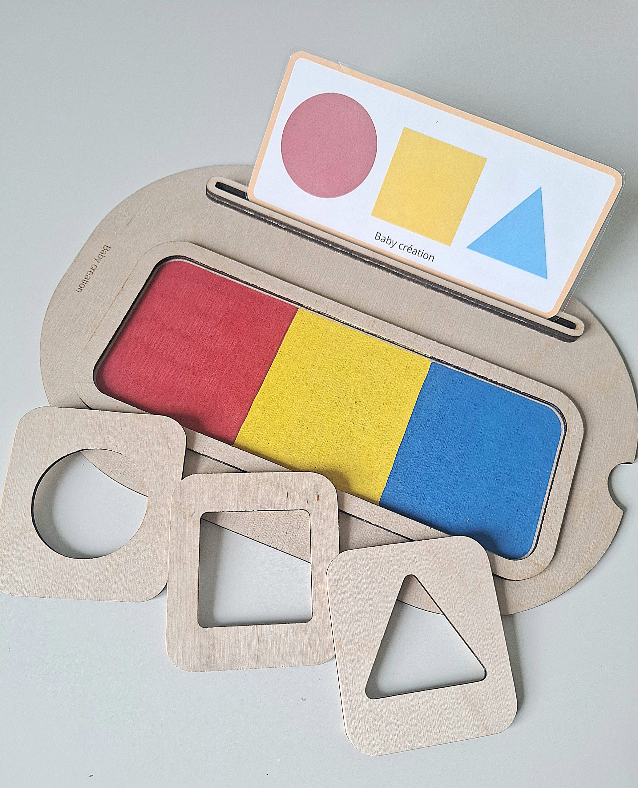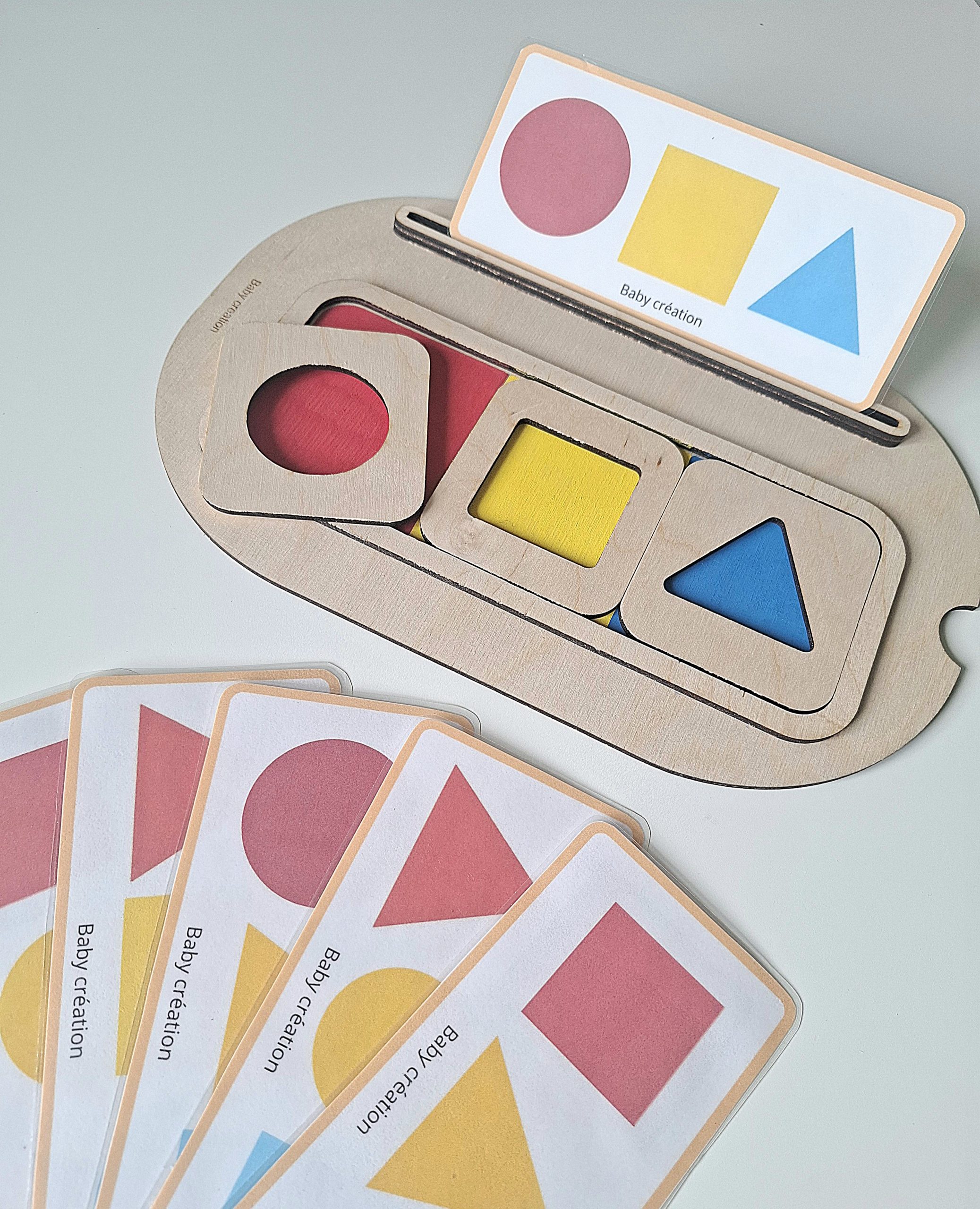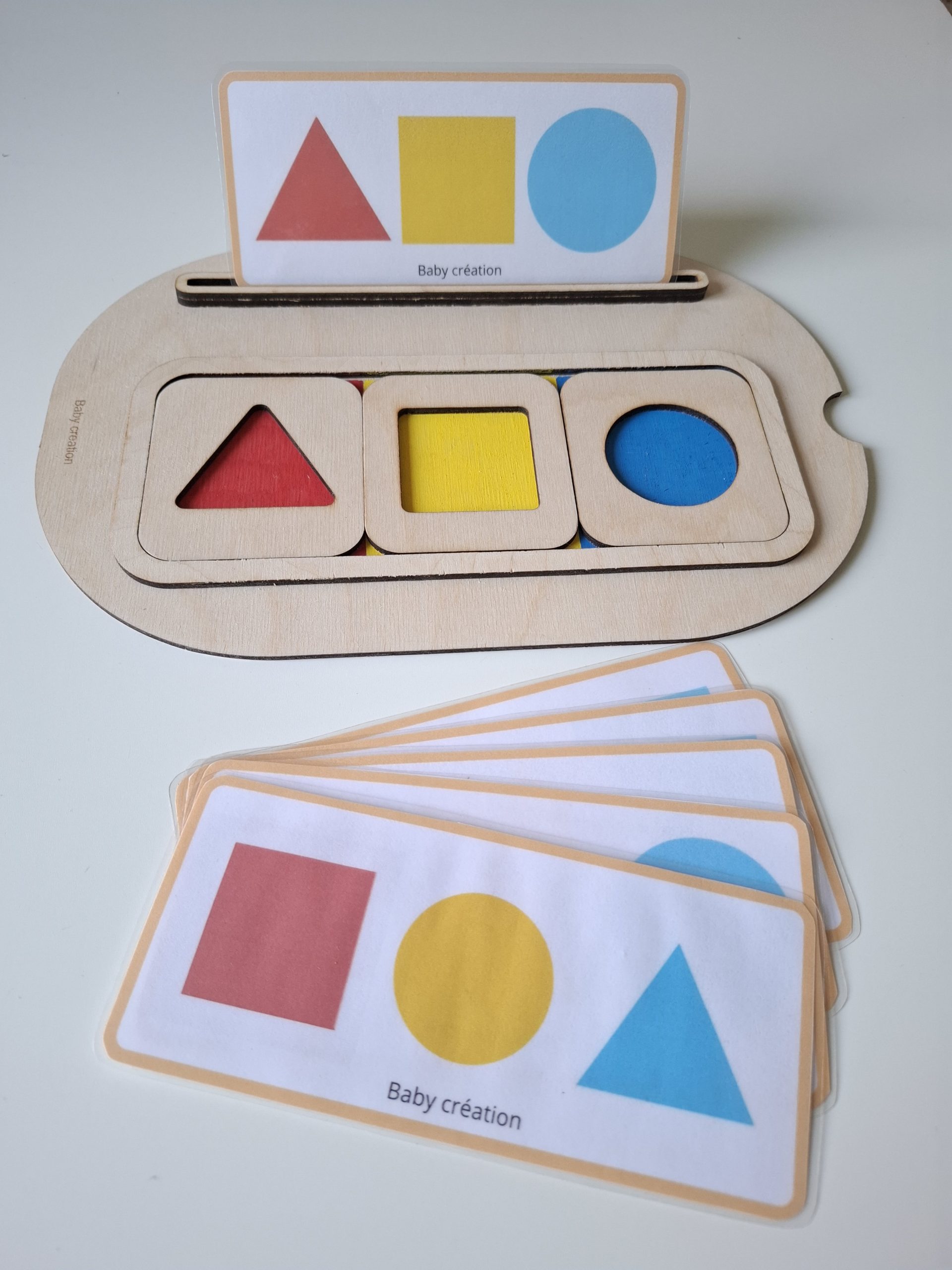 Il s’agit d’un jeu d’association basé sur les formes géométriques et les couleurs. L’enfant doit reproduire l’ordre des formes et des couleurs indiquées sur une carte-modèle en plaçant les pièces correspondantes dans le support en bois.