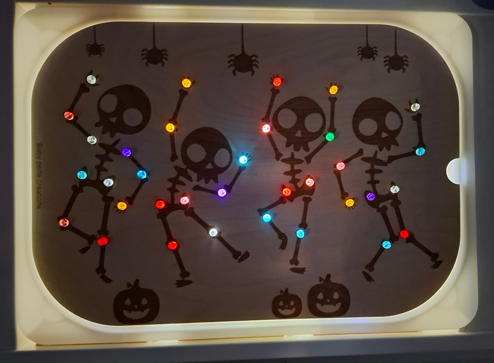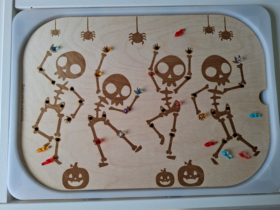 Ce grand panneau en bois sur le thème d’Halloween présente 4 squelettes, chacun avec de petits trous répartis sur le corps. L’enfant peut y placer des picots selon son choix. Pour un effet lumineux, des picots translucides peuvent être utilisés et éclairés avec une lampe derrière le panneau, créant un spectacle coloré et scintillant. Les pions sont fournis avec le plateau pour une utilisation immédiate et sécurisée