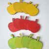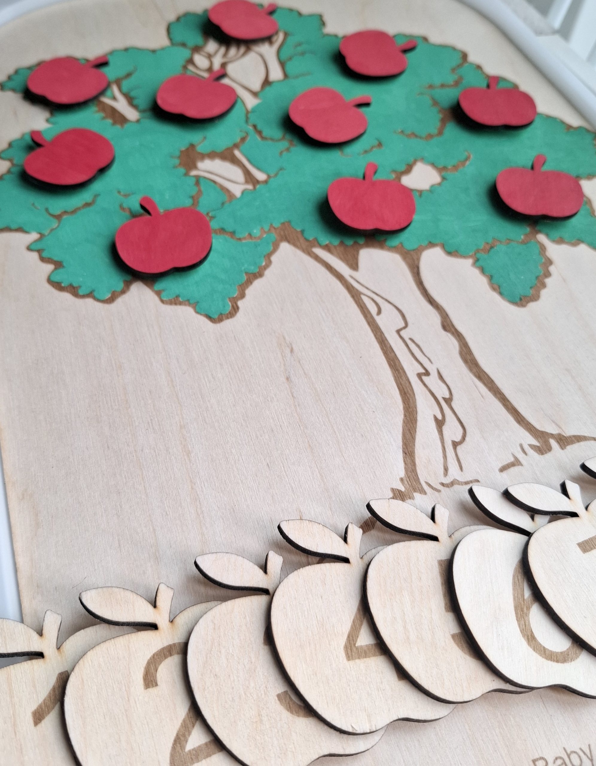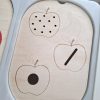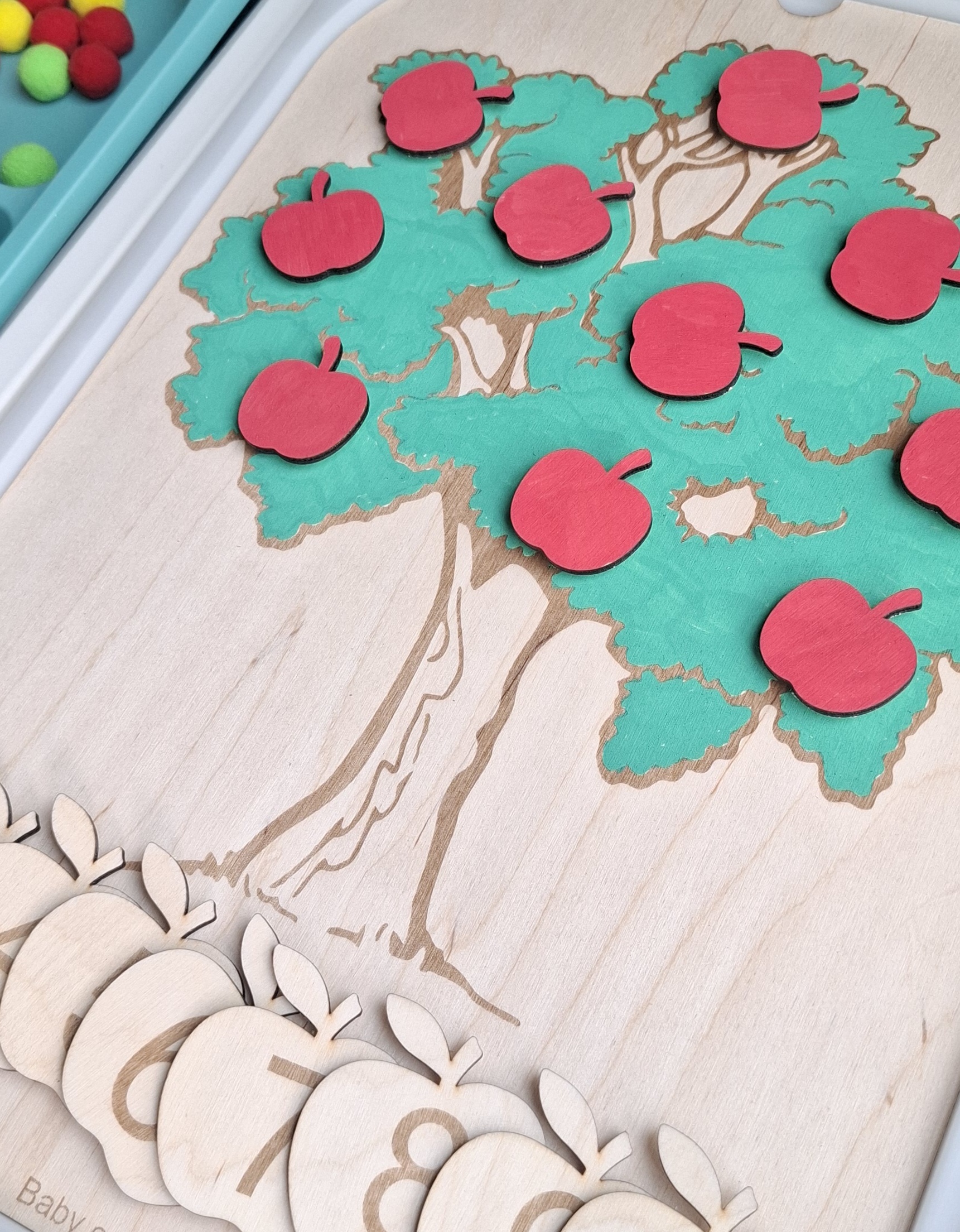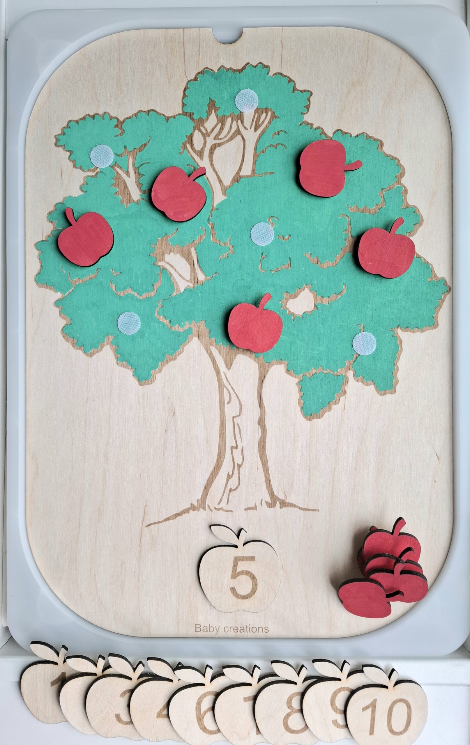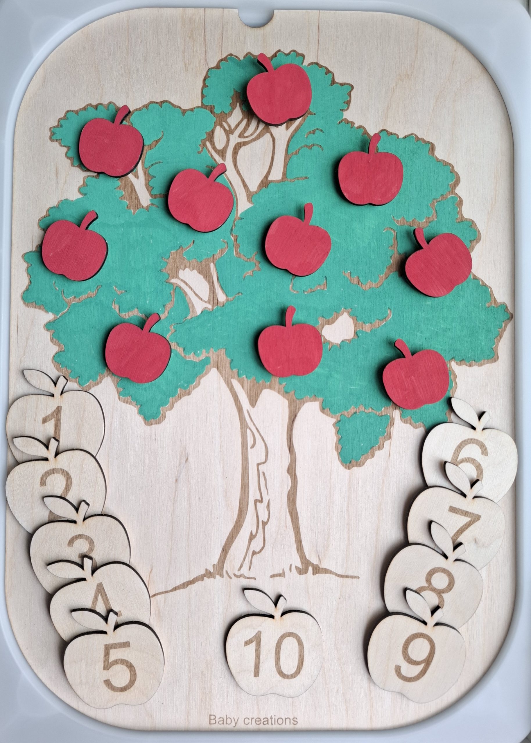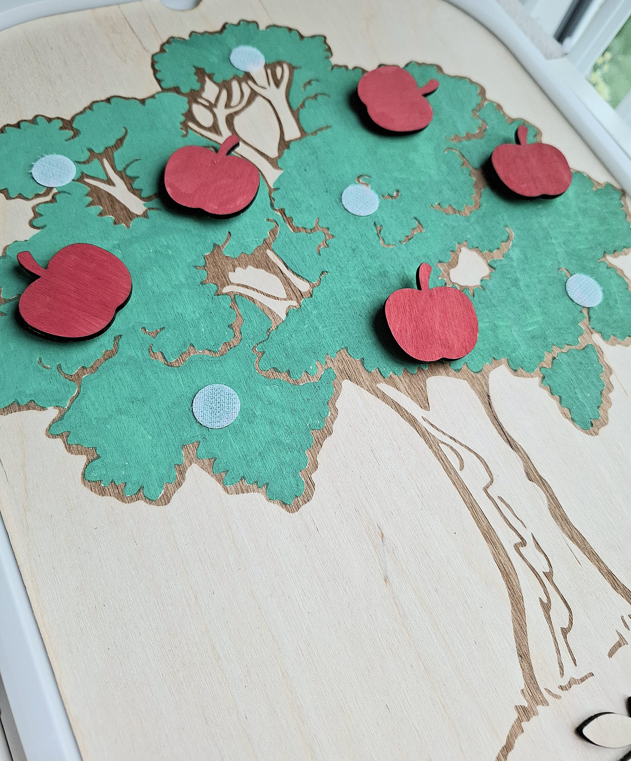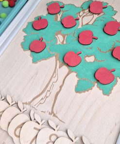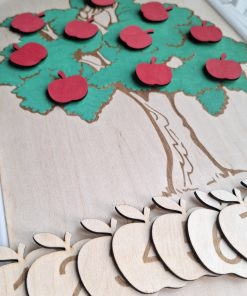 Un grand support en bois représentant un pommier, accompagné de 10 petites pommes à scratcher. L’enfant peut les placer et retirer à sa guise, comme s’il cueillait de vraies pommes.