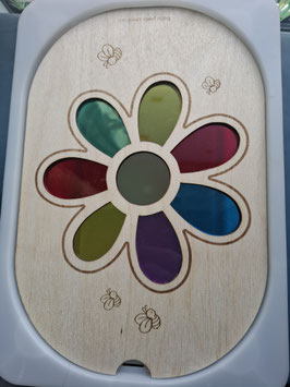 Parfaite pour développer la motricité fine dès 12 mois, cette activité invite l’enfant à placer des boules colorées dans les trous prévus à cet effet. Pour rendre le jeu encore plus captivant, une lampe peut être placée sous le bac pour illuminer les pétales des fleurs, ou on peut profiter de la lumière naturelle du soleil.