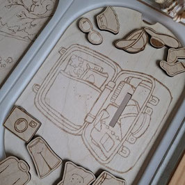 L’enfant apprend à reconnaître différents vêtements et à les ranger dans une valise adaptée. Cette activité ludique lui permet de développer sa motricité fine tout en découvrant les noms et fonctions des vêtements.