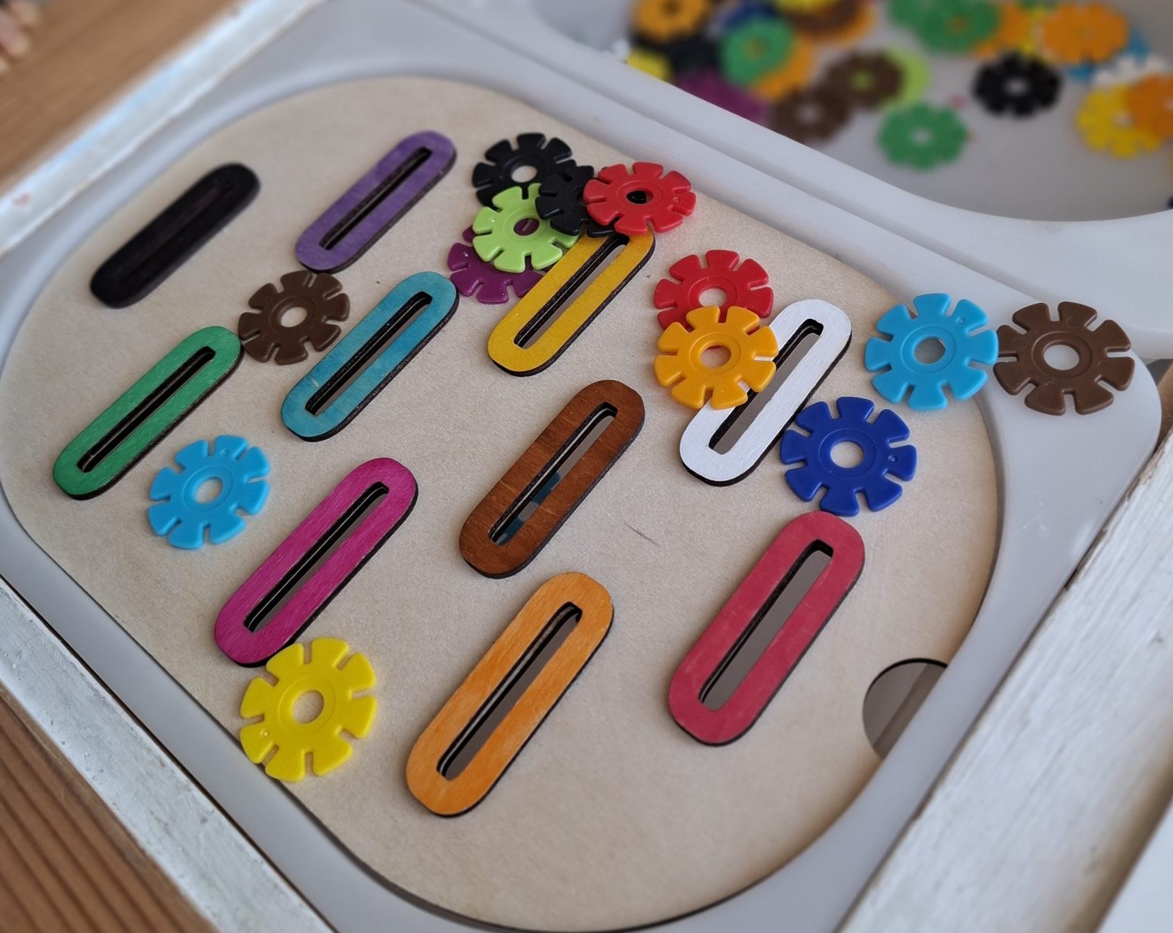 L’enfant s’amuse à insérer des jetons colorés dans les fentes correspondantes. Chaque jeton doit être placé dans la fente de la même couleur. Ce jeu simple et ludique aide l’enfant à développer sa motricité fine tout en apprenant à reconnaître et associer les couleurs.