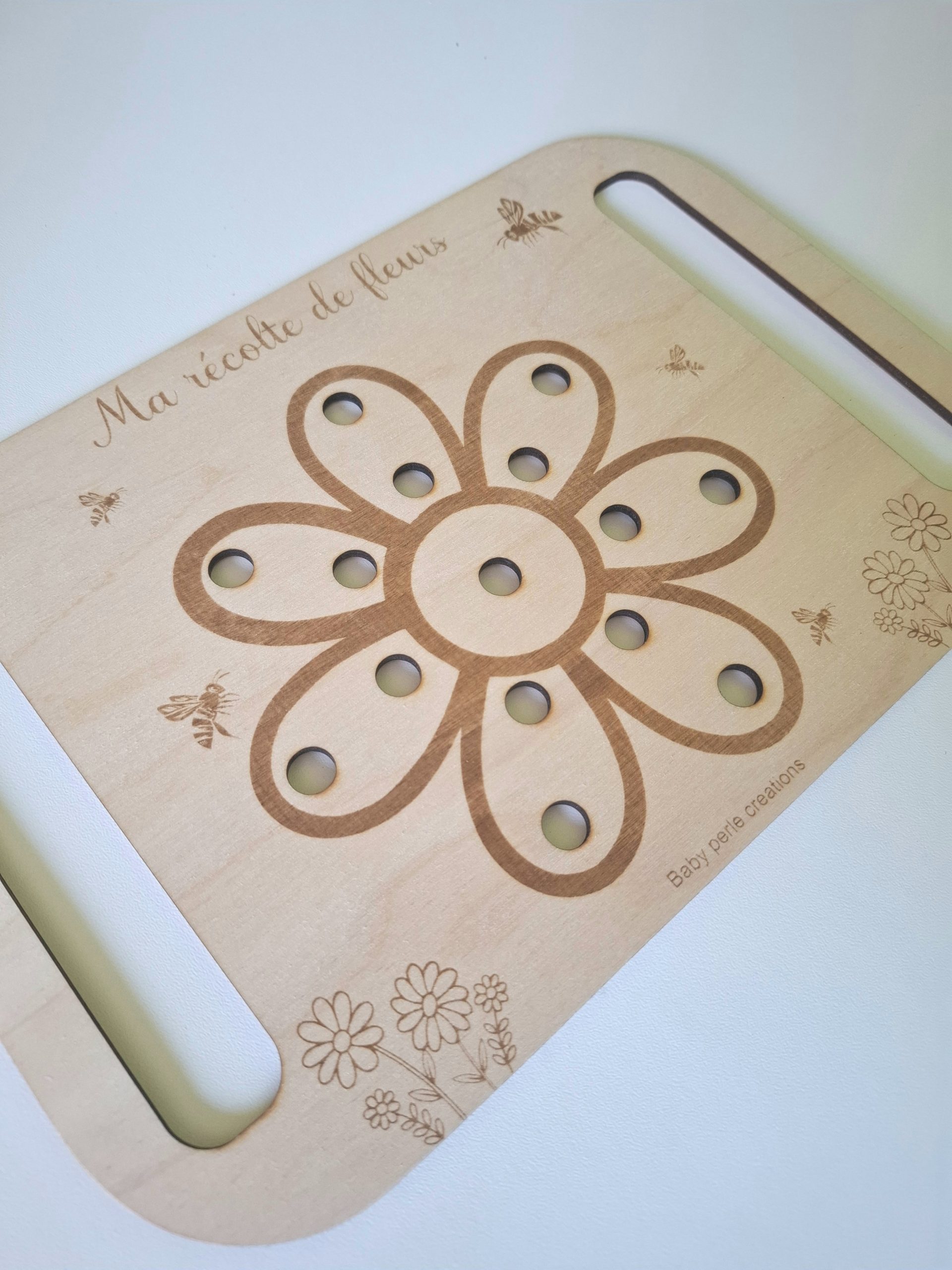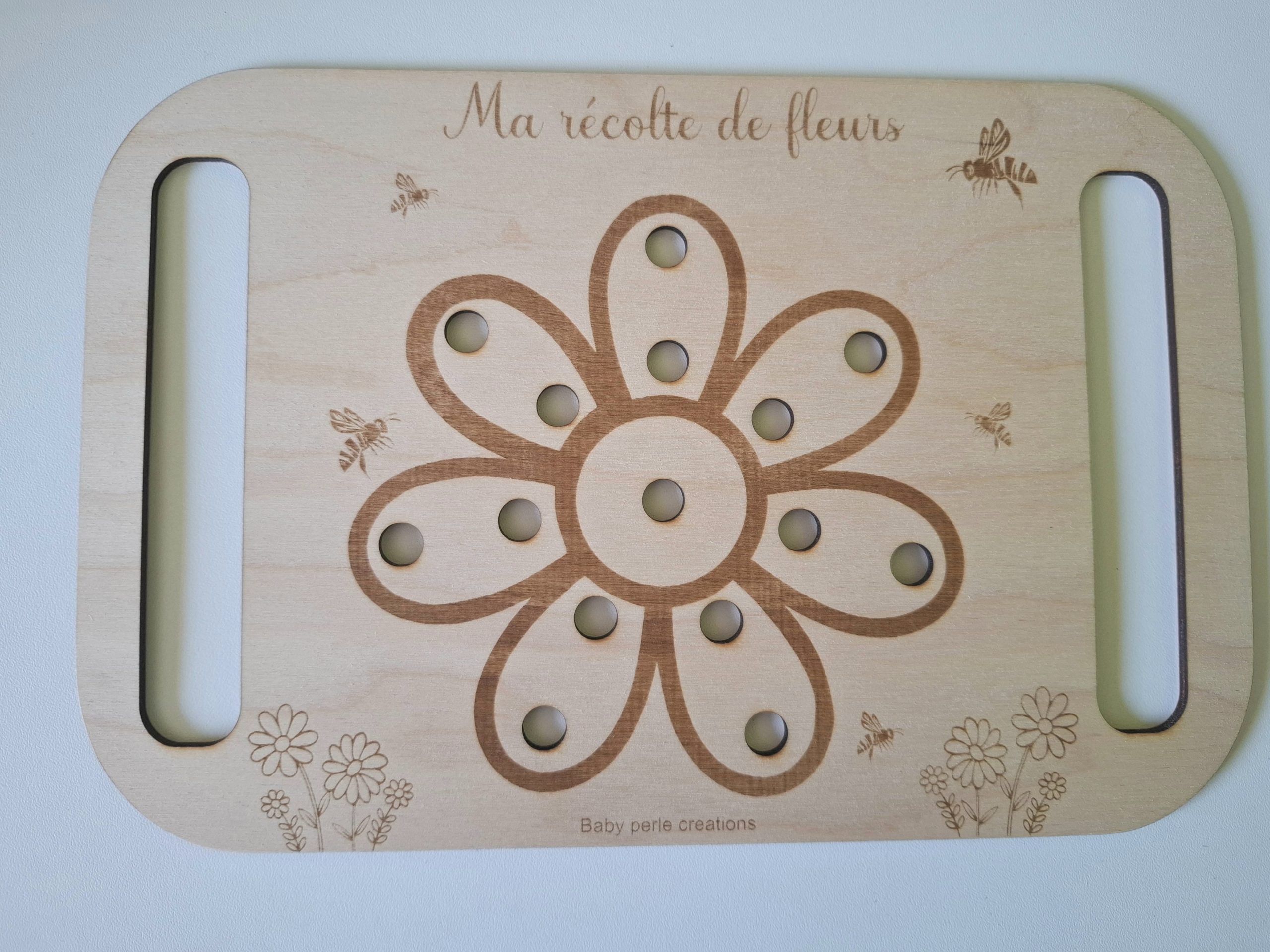 Lors de sa promenade , l’enfant peut insérer de vraies fleurs dans des trous prévus à cet effet sur un support (panneau, cadre, ou autre).