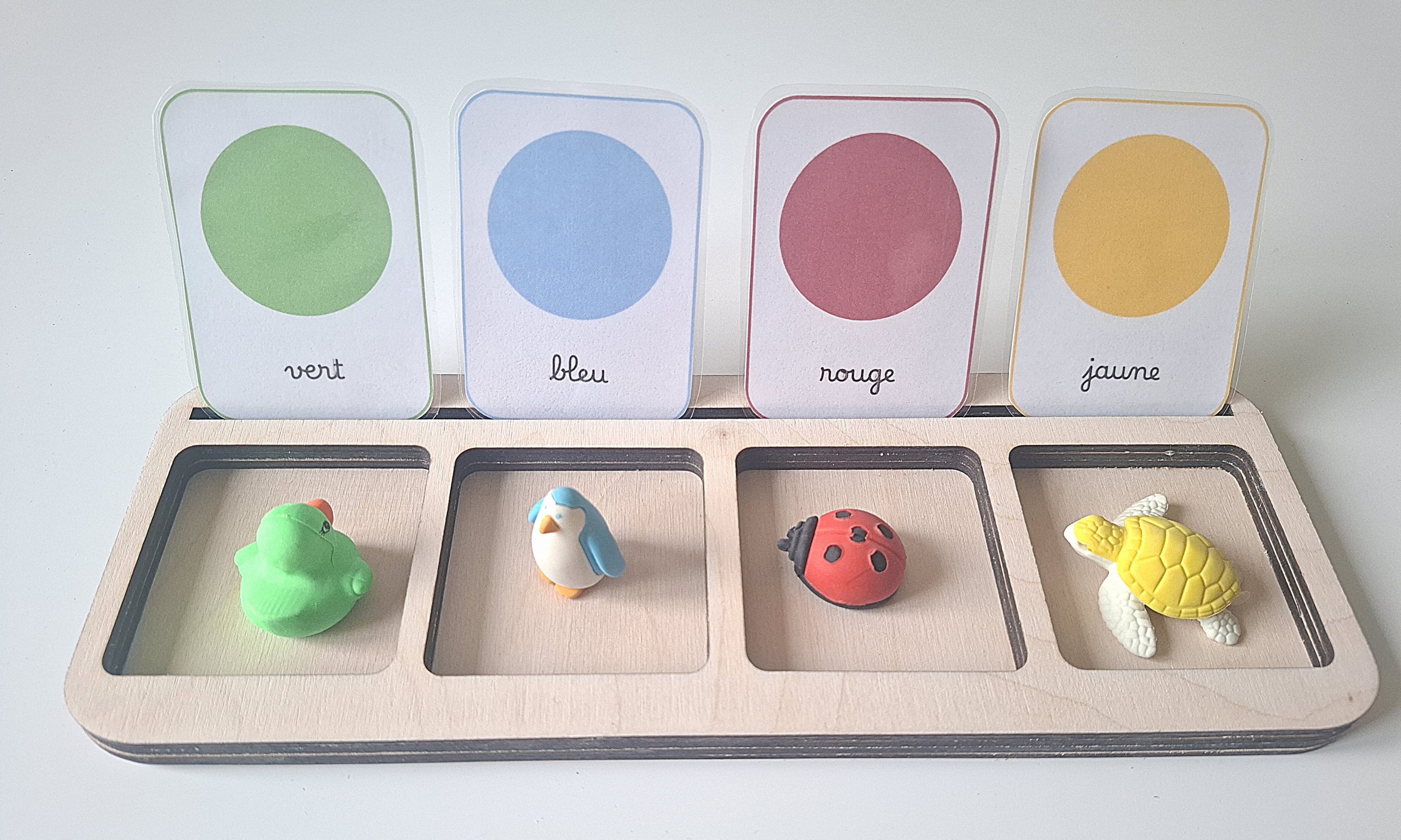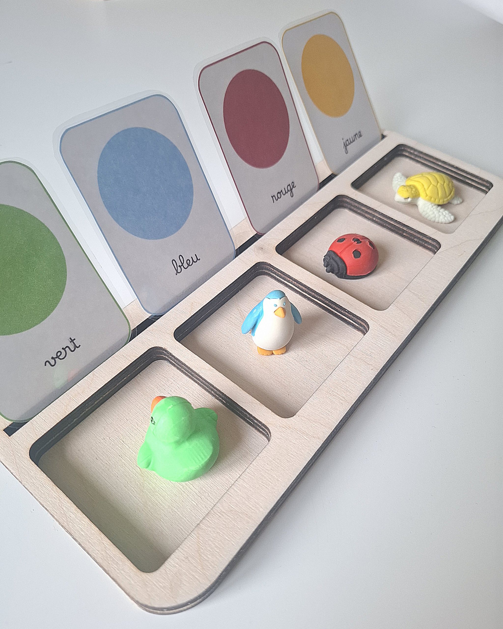 Ce plateau de tri en bois est conçu pour accompagner les activités éducatives inspirées de la pédagogie Montessori.
